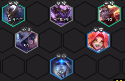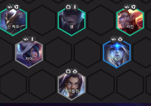 핵심 유닛은 라칸+신짜오 두 개만으로도 수호자 천상 각각 2 시너지를 받을 수 있음.